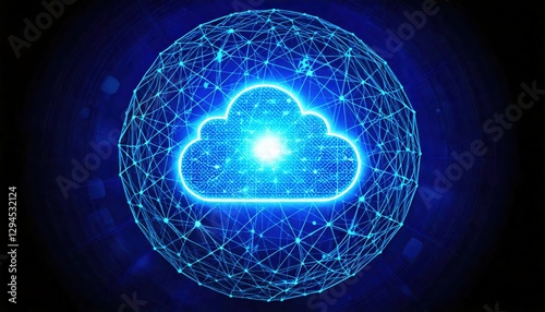 A radiant blue cloud icon encircled by a digital network, representing cloud computing, data storage, online connectivity, and advanced technology.