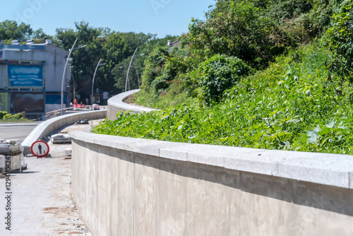 Chodnik i mur oporowy (prace końcowe) na odnowionej drodze w mieście. Chodnik przylegający do nowo wybudowanego muru oporowego, z starannie przyciętą zieloną roślinnością po jednej stronie.