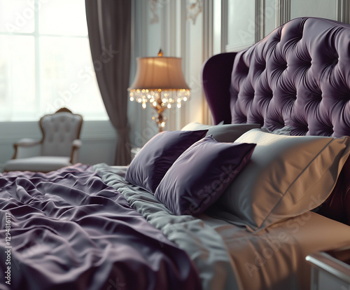 Łóżko z fioletową pościelą i lampką na stoliku