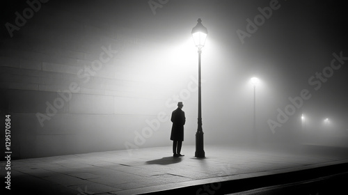 solitary figure stands under streetlamp on foggy city street, creating mysterious and atmospheric scene. dim light casts long shadows, enhancing eerie ambiance of deserted urban landscape