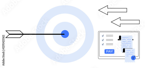 Arrow hitting center of target, arrows pointing to a digital tablet with payment form and receipt. Ideal for finance, precision, payment processing, goal setting, fintech, business strategy