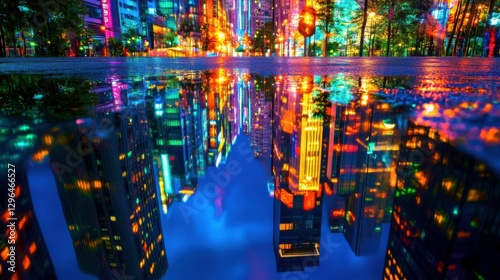 Urban Cityscape Reflections in Water Puddle at Night