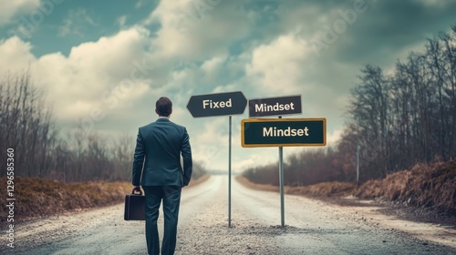 A businessman holding a briefcase, staring at two road signs--one for "Fixed Mindset" and one for "Growth Mindset"--symbolizing career choices.