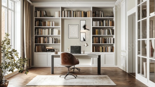 Home office library with floor to ceiling white bookshelves and mid century desk and chair