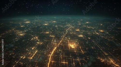 an aerial view of a sprawling city at night, with glowing grid-like streets, skyscrapers lit up, and a dark sky with faint stars above.