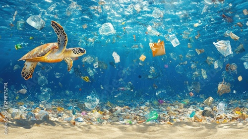 Glimpse into an ocean scene where colorful plastic waste floats on calm waters, juxtaposed against a serene sandy beach under a bright blue sky.