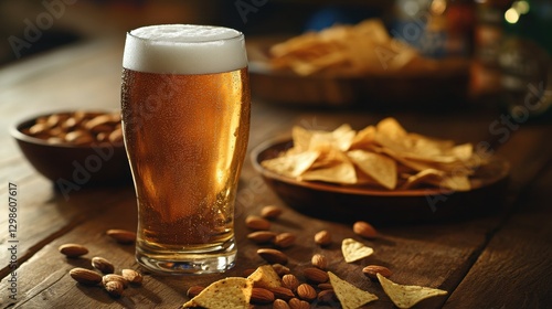 A cold beer with nuts and tortilla chips on a rustic wooden table