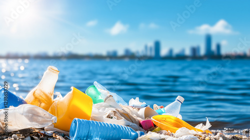 Plastic Garbage and Trash on a Beach with Cityscape in the Background