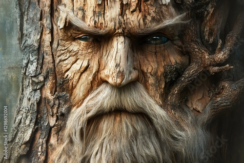 Ancient tree spirit emerging from bark with piercing eyes