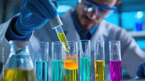 A scientist in a lab coat, pouring colorful liquids into test tubes