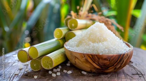 Sugarcane and Refined Sugar in Wooden Bowl Natural Sweetness