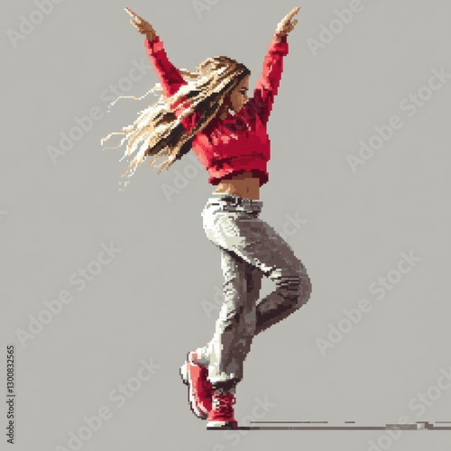 Young Woman Dancing Dynamically In Red Top And Jeans