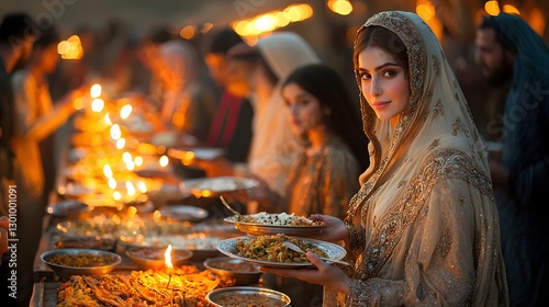 Glowing Ramadan Feast at Sunset with Communal Gathering and Adhan Echoing
