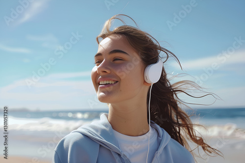 Młoda kobieta słuchająca muzyki na plaży — relaks, szczęście i chwile spokoju