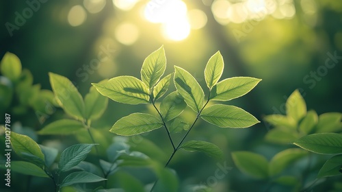 Banner with a selective focused tree branch with green leaves on a blurred greenery background.