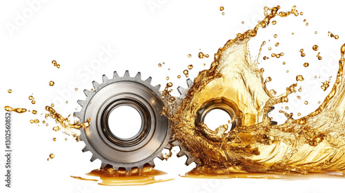Metal gears splashing in golden motor oil display dynamic movement and texture