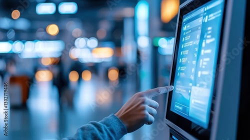 Person using self-service kiosk in modern airport terminal