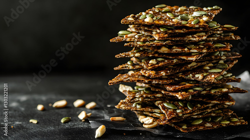 Healthy seed crackers with nuts on rustic background for snack ideas on black background with empty space for text.