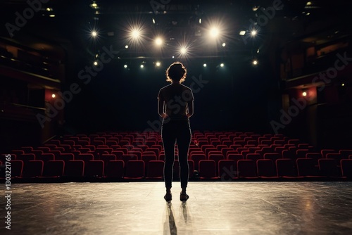 Dramatic Stand: A solitary figure stands poised on a theater stage, bathed in the ethereal glow of spotlights, facing towards an empty auditorium filled with rows of empty seats.