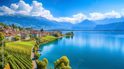 Montreuxs iconic lakeside view from the sky, with vineyards rolling down the slopes and the Swiss Alps towering beyond.