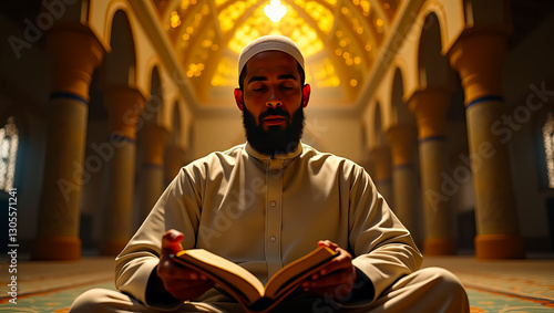Serene Muslim Man Praying in Mosque Reading Holy Quran Book Peaceful Spiritual Islamic Faith Religious Devotion God Belief Spirituality Tranquility