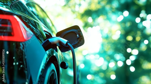 EV Charging Station Close-up Composition, Green Background, Sustainable Energy, Electric Vehicle, EV Charging Electric Car, Green Energy