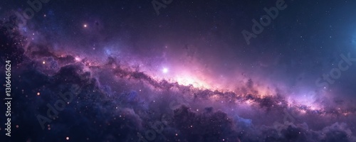 Abstract starry space background with shining star dust and nebula. Realistic galaxy milky way view with planets. Purple cosmic night sky with calm glistering stellar light and galactic cluster.