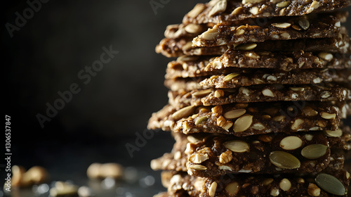 Stack of crunchy nut and seed brittle on dark moody background with empty space. For culinary articles, blog posts.