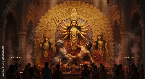 Grand Durga Puja Celebration in a Majestic Temple, Featuring a Magnificent Idol of Goddess Durga with Her Ten Arms, religious ceremony, navratri, indian culture, ten-armed goddess, powerful deity