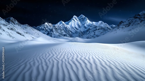 Moonlit snow patterns on mountain landscape with majestic Himalayan peaks glowing under starry night sky, pristine winter wilderness scene in blue tones.