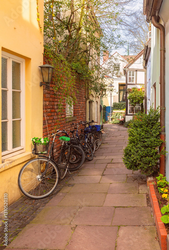 Narrow cobbled street in the historic Schnoor district of Bremen, with old houses, Germany