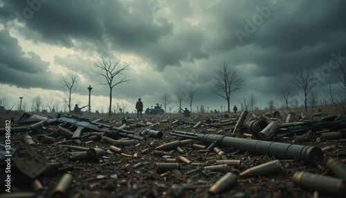 Dramatic Scene of War with Empty Shell Casings and Dark Skies