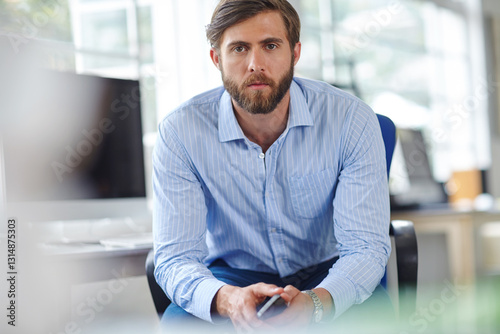 Man, portrait and professional architect in office, project management and business ambition. Workplace, employee confidence and interior designer at architecture firm, creative and person in chair