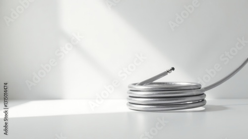 A metallic silver hose neatly coiled on a bright white surface, bathed in soft, natural light
