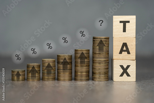 Stale zwiększający się procent płaconych podatków. Rosnące słupki monet obok drewnianych kostek z napisem TAX.