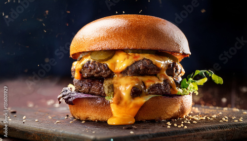 Un bon burger deux steak dégoulinant de cheddar fondu