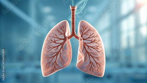 Anatomical illustration of human lungs with detailed branching structure.