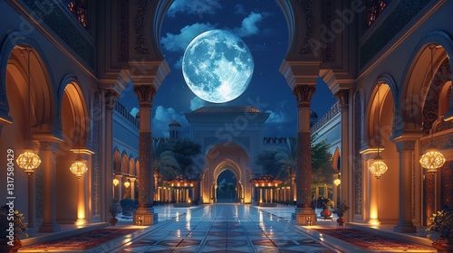 Majestic Islamic palace courtyard A royal Middle Eastern palace at night
