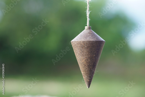 Old plumb bob, plummet or conical iron hanging with rope for measurement level, use for determining perpendicularity . Concept, work tool for construction and carpentry.