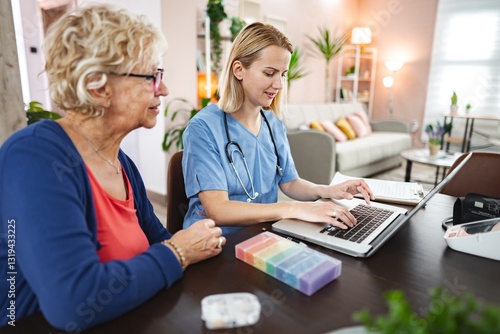 Caring interaction between a nurse and a senior woman in a cozy home setting