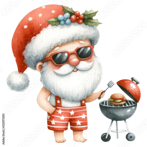 Summer Santa Claus concept. A whimsical Santa wearing sunglasses and shorts barbecues in a festive setting, blending holiday cheer with summer vibes.