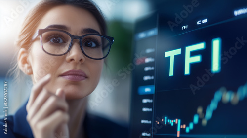 Kobieta w Okularach Przy Wykresie Giełdowym, TFI, Inwestycje, Fundusze, Finanse i Analiza Rynkowa, Towarzystwo Funduszy Inwestycyjnych.
