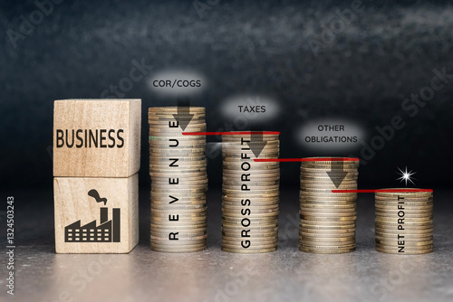 słupki monet w formie malejących wartości. Koncepcja obliczania zysku netto w biznesie.