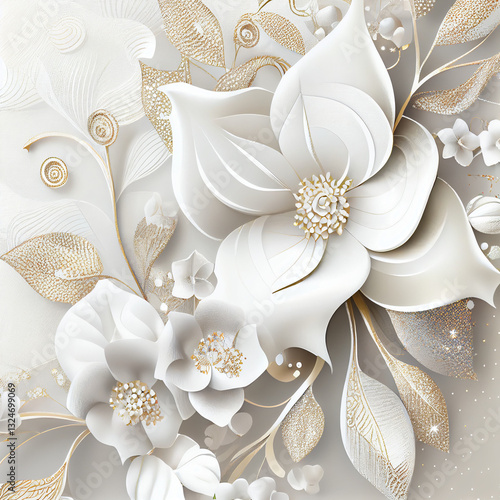 Elegancki biały ornament kwiatowy – delikatny wzór florystyczny w stylu glamour, luksusowa dekoracja z bogatymi detalami, subtelna kompozycja roślinna w pastelowych odcieniach, nowoczesna sztuka cyfro