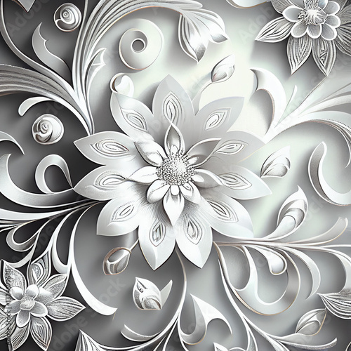 Elegancki biały ornament kwiatowy – delikatny wzór florystyczny w stylu glamour, luksusowa dekoracja z bogatymi detalami, subtelna kompozycja roślinna w pastelowych odcieniach, nowoczesna sztuka cyfro