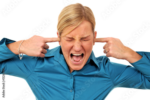 Junge Frau hält sich wütend die Ohren zu