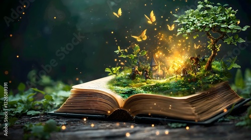 A whimsical and enchanting scene of a fairy tale kingdom emerging from the pages of a book resting in a peaceful meadow complete with tiny knights enchanted forests and magical animals