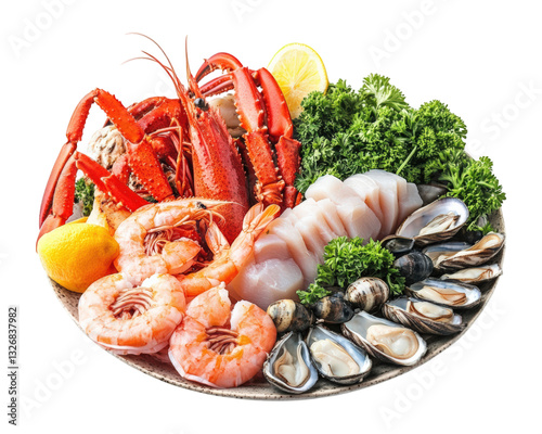 Fresh seafood platter with shrimp, crab, oysters, and fish garnished with lemon and greens, perfect for delightful meal