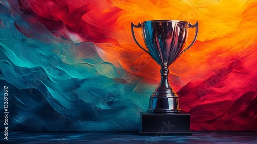 Vibrant Colorful Wave Patterned Background with Shining Trophy in the Foreground Representing Success and Achievement