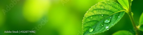 Close-up of fresh green leaves with dew drops in bright sunlight, vibrant, foliage, renewal
